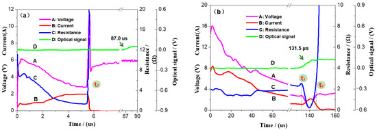 The VCRO curve of the igniting parts of the semiconductor bridge; (a) is the VCRO curve of D1-LS; (b) is the VCRO curve of D2-nAl/MoO3/RGO (fiber).