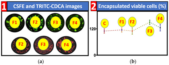 CFSE and TRITC-CDCA microscopic images and Encapsulated cell viability. (a). Top row Formulations 1 to 4 CFSE stained indicating distribution of MIN6 pancreatic β-cells in green. Bottom row TRITC conjugated CDCA images showing CDCA distribution in red. (b). Graph of % of viable cells post-encapsulation. The control is unencapsulated MIN6 pancreatic β-cells C. Graphed as as Mean ± SEM.