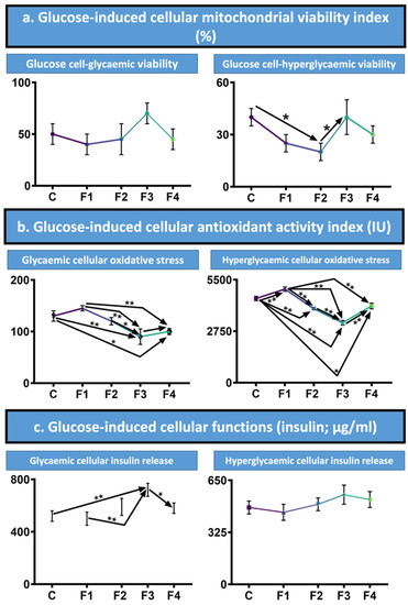 Glucose-induced viability, antioxidant activity and insulin release. (a). Glycaemic and hyperglycaemic conditions cell viability (%). (b). Glycaemic and hyperglycaemic antioxidant activity as oxidative stress (IU). (c). Glycaemic and hyperglycaemic cellular insulin release (µg/mL). Assessed on formulations 1 to 4 with unencapsulated MIN6 pancreatic β-cells as the control (C). Presented as Mean ± SEM, with arrows used to denote any statistical significance between data points. * p < 0.05, ** p < 0.01.