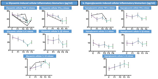 Cytokine biomarker detection in glycaemic and hyperglycaemic conditions. (a). Glycaemic-induced pro-inflammatory biomarker release TNF-α, IFN-γ, IL-6, and IL-1β; and anti-inflammatory IL-10 (pg/mL). (b). Hyperglycaemic-induced pro-inflammatory biomarker release TNF-α, IFN-γ, IL-6, and IL-1β; and anti-inflammatory IL-10 (pg/mL). Assessed on formulations 1 to 4 with the control being unencapsulated MIN6 pancreatic β-cells (C). Presented as Mean ± SEM, with arrows used to denote any statistical significance between data points. * p < 0.05, ** p < 0.01.
