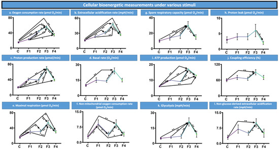 A range of bioenergetic measurements were taken under a variety of stimuli, including on the control samples (Figure 4). These measurements included assessments of oxygen consumption rates (pmol O2/min), basal oxygen rates (O2/min), maximal respiration rates (pmol O2/min), non-mitochondrial oxygen consumption rates (pmol O2/min), spare respiratory capacity (pmol O2/min) and ATP production rates (pmol O2/min). In addition to extracellular acidification rates (mpH/min), proton production rates (pmol/min), rates of proton leaks (pmol O2/min), coupling efficiency (%), rates of glycolysis (mpH/min) and non-glucose-derived extracellular acidification rates (mpH/min).