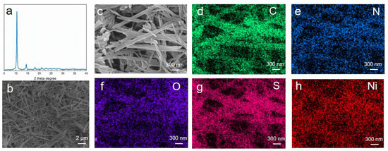 Ni-MOFs were prepared by the hydrothermal reaction of 2-Mercaptopyridine and Ni(NO3)2·6H2O in a molar ratio of 2:1 in water at 75 °C. Figure 1a shows the XRD pattern of as-prepared Ni-MOF crystals, and the intensive diffraction peaks located at 10.4° and 14.5° are assigned to (002) and (111) planes of Ni-MOF. The SEM image shows that as-prepared Ni-MOFs are present in 1D nanorod morphology (Figure 1b). The EDS mapping images confirm the homogeneous distribution of C, N, O, S, and Ni elements on 1D Ni-MOF nanorods (Figure 1d–h).