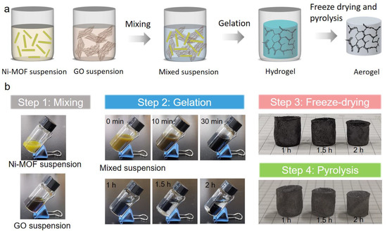 The preparation processes for 3D Ni-MOFs/rGO aerogels and their derived aerogels are schematically illustrated in Figure 2a. Briefly, the GO aqueous suspension and the presynthesized 1D Ni-MOF nanorods are mixed by vigorously shaking. Due to the metal-oxygen covalent or electrostatic interactions between abundant free Ni2+ on the surface of 1D Ni-MOF nanorods and oxygenated functional groups (-OH and -COOH) of GO, the GO nanosheets can prevent insoluble 1D Ni-MOF nanorods from precipitation, forming stable suspensions. The mixed suspensions gradually transform into colloids and form stable gels in 1 h under 95 °C. By prolonging the gelation time, the volume of the gels gradually decreases (Figure 2b), indicating that GO could be sufficiently reduced by Ni-MOF without additional chemicals. The ratio of Ni-MOF and GO play a key role in the gelation process of Ni-MOF/rGO hydrogel. A less amount of Ni-MOF will prolong the gelation time, and the resultant gel is brittle due to the fewer sites for cross-linking. If the ratio of Ni-MOF and GO is above 1:1, GO could be sufficiently reduced, and the residual Ni-MOF will be precipitated. Thus, the ratio of Ni-MOF and GO should be optimized to obtain the hydrogels.