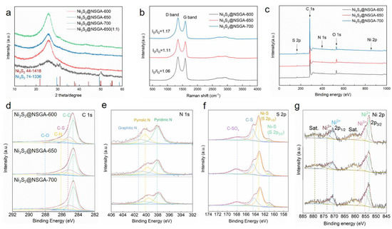 (a) XRD patterns, (b) Raman spectra, (c) XPS survey and high-resolution XPS spectra of (d) C 1s, (e) N 1s, (f) S 2p, (g) Ni 2p of as-prepared Ni3S2@NSGAs.