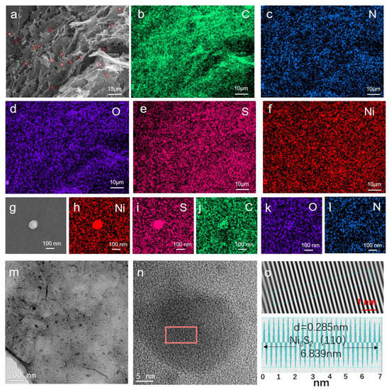 (a,g) SEM and (b–f,h–l) corresponding EDS mapping images, (m) TEM, (n) HRTEM, and (o) IFFT image and the measured interplanar spacing of as-prepared Ni3S2@NSGA-650.