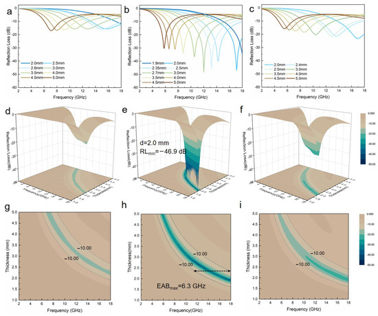 (a–c) Reflection loss (RL) curves, (d–f) 3D and (g–i) 2D representations of the RL for Ni3S2@NSGAs pyrolyzed at different temperatures.