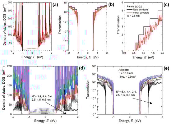 The impact of attaching MECs is also visible in the appearance of metal-induced gap states (MIGS) between the valence band maximum (VBM) and conduction band minimum (CBM). However, these states are clearly strongly localized as can be seen in Figure 2b that reports the transmission through the 2.5 nm-wide PNR with IECs and MECs. The transmission is extremely low inside the bandgap so the transport gap (ETG) exists. Therefore, MIGS do not contribute to transport, which is beneficial for FETs that need a transport gap to achieve efficient switching between the ON and OFF states. These findings demonstrate that PNRs are a more plausible solution of ultra-scaled FETs than GNRs given the considerable metallization-induced ETG decrease reported for GNRs with MECs [31]. While the energy gap of PNRs is immune to MEC-induced metallization effects, the characteristic shown in linear scale in Figure 2c demonstrates a significant transmission suppression by MECs. Lorentzian oscillations are also reported in the transmission as in the DOS curves, and the reasons are given in the Supplementary Materials—Supplementary Note S1. In contrast to ideal contacts that result in unitary transmission probability for each conducting mode and a step-like transmission function, attaching MECs described within the WBL model allows destructive interference for electron waves injected from the contact into the nanoribbon [31,33,34].