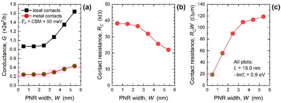 Width-dependence of (a) conductance, (b) contact resistance, and (c) width-normalized contact resistance in 15 nm-long PNRs. For all MEC-PNRs, −ImΣR = 0.9 eV.