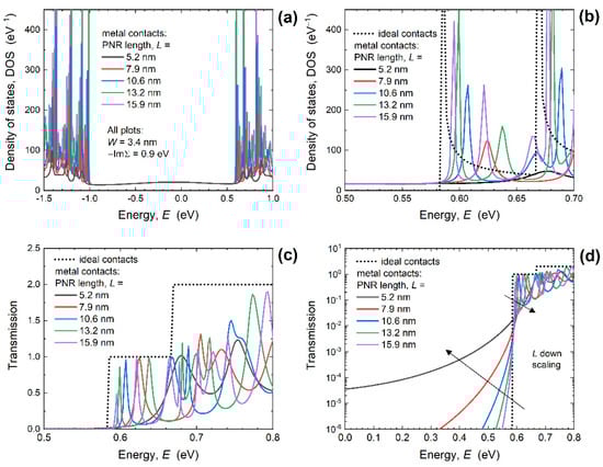 DOS in (a) entire energy range, and (b) in the conduction band for 3.4 nm-wide PNRs of various lengths with ideal and metal edge contacts. Influence of length downscaling on transmission in the (c) linear and (d) logarithmic scale. For all MEC-PNRs, −ImΣR = 0.9 eV.