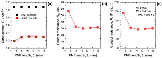 Length-dependence of (a) conductance, (b) contact resistance, and (c) width-normalized contact resistance in 3.4 nm-wide PNRs. For all MEC-PNRs, −ImΣR = 0.9 eV.