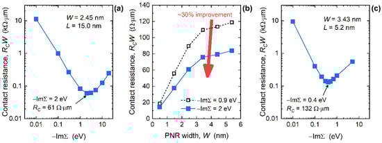 Figure 6a reports the dependence of RCW on the interaction strength in 2.45 nm-wide and 15 nm-long phosphorene nanoribbons. Starting from very weakly interacting metals (−ImΣR = 0.01 eV) where RCW = 11.2 kΩ µm, the resistance first decreases and reaches a minimum of 61 Ω µm for the optimum −ImΣR of 2 eV, and then increases to 247 Ω µm when strongly-interacting (−ImΣR = 20 eV) MECs are attached to the PNR. In comparison to the initial resistance value of 90 Ω µm for W = 2.45 nm in Figure 3c, a careful choice of contact material can reduce RCW by 32%. Assuming the optimum interaction parameter of 2 eV for all 15 nm-long devices, in Figure 6b, we report RCW values for the entire examined PNR width range. In this case the resistance decreases from 84 Ω µm for W = 5.4 nm down to 14 Ω µm in the 0.5 nm-wide MEC-PNR. The improvement is almost constant and equals ~30% for nanoribbon widths down to ~1.5 nm, whereas RCW drops by 23% for 0.5 nm-wide PNRs with MECs and −ImΣR = 2 eV. The characteristics reported in Figure 6b indicate that a minimum RCW of ~90 Ω µm is achievable in large-area phosphorene devices with edge contacts, which puts these lower quantum limits of RC in phosphorene close to the best reported contact resistance in graphene devices [24,35]. In addition, our results show that the contact resistance can be further minimized to ~14 Ω µm by using ultra-narrow PNRs as channel material in ultra-scaled FETs.