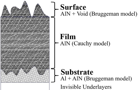 To characterize the samples, a multilayer model was used (Figure 1) with the calculation according to the generalized Fresnel formulas [49]. In our case, we limited the model to three layers: (1) a rough AlN layer on the surface; (2) AlN film under a rough layer; (3) a rough Al buffer layer, which served as a substrate in the ellipsometry model. Aluminum has a high absorption coefficient, and at a thickness of several tens of nanometers, is already opaque to probe radiation, so the underlying layers do not contribute to the measured ellipsometric angles.