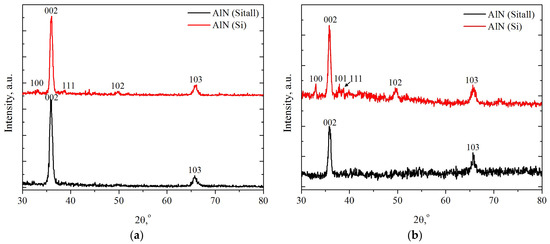 AlN films were obtained by the magnetron sputtering of a target of pure Al (99.99%) in a nitrogen–argon medium (with high-purity gases, 99.999%) at a constant substrate temperature of 350 °C. The substrates were made of monocrystalline Si (100), grade KDB-10 (Ostec-Integra Ltd., Moscow, Russia), and glass ceramics, grade ST-50-1-1-0.6 (C-Component, Moscow, Russia). To improve the adhesion of the AlN films, aluminum and vanadium buffer layers with a thickness of several tens of nanometers were deposited onto the substrates. Additionally, aluminum is important for practical applications because it is used as the electrode and the first structural component of the Bragg reflector [1,4,10]. Before the deposition of the AlN film, the surface of the substrates was cleaned with an alcohol–acetone mixture followed by rinsing with deionized water. The flow rates of the working gases Ar and N2 were 4 and 10 sccm, respectively, and the power of the magnetron was 700 W. The background pressure in the vacuum chamber was 0.07 Pa. These parameters were chosen as optimal for AlN film deposition based on the previous set of our experiments. The deposition time was 118 min.