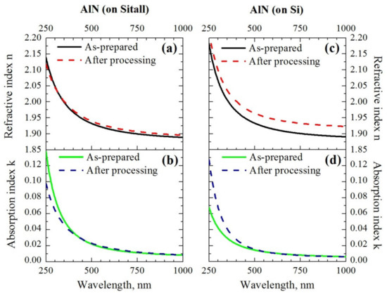 The optical constants dependencies on wavelength λ for the AlN layer: (a) the refractive index n as-prepared and after low-energy mode on the Sitall substrate; (b) the absorption index k on Sitall; (c) the refractive index n on Si; and (d) the absorption index k on Si. Parameter errors: δn = 0.01 and δk = 0.002.