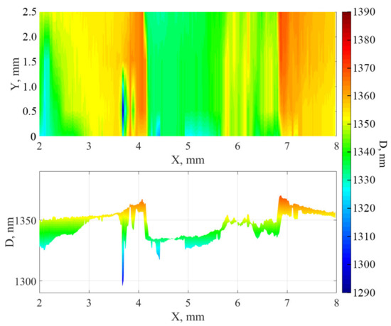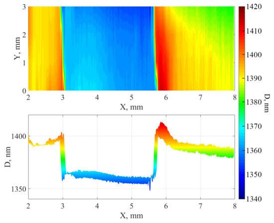 The surface was also mapped using a spatial scanning ellipsometer. During processing, a model with a fixed transition layer thickness of 20 nm was used to construct a principal map of the thickness distribution (Figure 7 and Figure 8). As can be seen from the distributions, when the surface is treated with cluster argon ions and a mask is used for the sample, “elongated hillocks” are formed along the edges of the treated area, the cause of which may be the process of redeposition or the significant lateral displacement of atoms at the edges of the area.