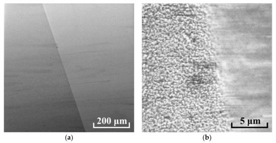 SEM images of the border between as-prepared (left sides) and smoothed areas (right sides) of AlN film on Sitall substrate for different magnifications marked by scale bar: (a) 200 µm, (b) 5 µm.