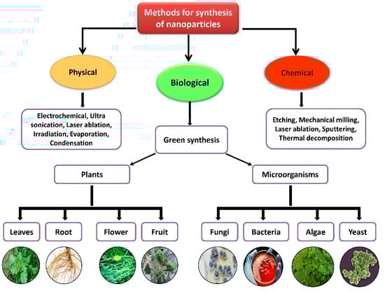 Nanoparticles with sizes ranging from 1 to 100 nm bind larger particles to atomic or molecular structures [23]. They are synthesized via different approaches, mainly divided into physical and chemical processes (Figure 2). The physical process involves laser ablation, condensation, evaporation, etc., whereas the chemical process involves hydrazine, sodium borohydride, green synthesis, etc. Using plant species to produce nanoparticles has been termed a green technique (Figure 2 and Figure 3) and the most reliable environmentally sustainable approach [24,25]. Nowadays, researchers are attracted towards biological synthesis, including the use of natural reducing, capping and stabilizing agents and without using hazardous, high-cost chemicals and high power consumption [26] (Figure 2 and Figure 3). NPs are extensively utilized in human contact areas (medicine, [27,28] and agriculture, [29,30]), and synthesis methods that do not use harmful compounds are increasingly required.
