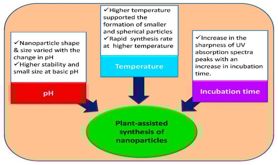 During the biosynthesis of nanoparticles, the major difficulties often faced are maintaining the structure and size of particles in addition to obtaining mono-dispersity in the solution phase. Nevertheless, these problems can be solved by monitoring development factors, namely pH, temperature and incubation time (Figure 5).