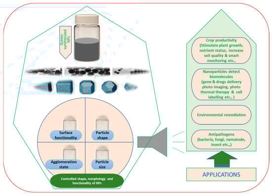 An overview diagram shows synthesized nanoparticles (NPs) produced via the green route for various biological applications. The different sizes, shapes and surface bio-functionalized NPs are developed in a controlled way for the target application.