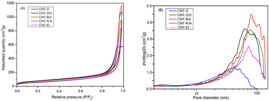 (A) Isotherms and (B) BJH distribution (adsorption branch) curves for CNT-O, CNT-OCl, and CNT-A samples.