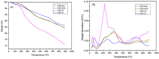 It can be seen (Figure 2A) that the weight loss for the functionalized samples was higher than for the oxidized one, indicating that the incorporation of amines to the structure of carbon nanotubes had been produced, especially in the case of ethylenediamine, which had been incorporated to a greater extent (weight loss of 27.6%, as compared to 16.6% for the other two amine samples). As a result, the DTG curve for CNT-Et (Figure 2B) exhibited two maxima in the 150–500 °C range, the intensities of which were significantly higher than those of the peaks detected in the DTG curves for the other CNT-A samples. The weight losses observed in the 150–600 °C range could be transformed into mmol/g CNT to obtain the degree of functionalization (Table 3), resulting in similar values to those obtained by elemental analysis (Table 1), except for CNT-Et.