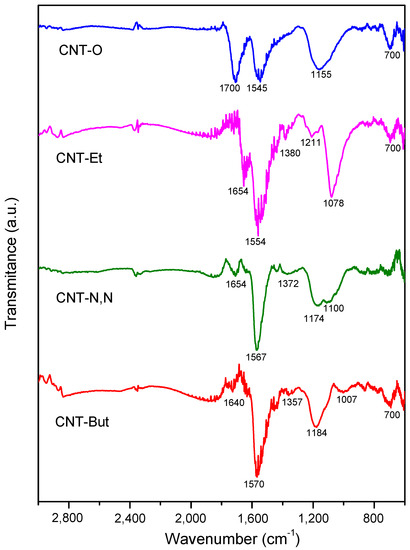 The ATR-FTIR spectra of samples are represented in Figure 3. The relative intensity of the band placed at 1700 cm−1, assigned to C=O stretching vibration in carboxylic groups [34,35], with respect to that located at 1545 cm−1 (associated to -C≡C- vibrations of skeleton of carbon nanotubes) [34,36] decreased significantly for the amine-functionalized samples, as compared to the oxidized carbon nanotubes. This implies a decrease in the number of carboxylic groups, which were transformed into amide groups, and a new band at 1640–1654 cm−1 assigned to the stretching vibrations of C=O in the amide groups appeared [37,38]. This band appeared as a shoulder in the case of CNT-But and CNT-N,N, and with high intensity in the spectrum of CNT-Et, indicating the presence of a higher number of amide groups for this last sample. In addition, the band at 1545 cm−1 shifted to higher wavenumbers (1554–1570 nm) in the CNT-A samples, due to the stretching vibrations of the C-N bonds [37]. The band placed at 1175 cm−1 in the spectrum of CNT-O, associated with the C-O stretching vibrations of carboxylic groups [36,39], was clearly shifted to 1078 cm−1 in the CNT-Et spectrum (a band of low intensity at 1100 cm−1 was observed for CNT-But and CNT-N,N). The higher anchoring of the ethylenediamine with respect to the other two amines was also corroborated by the presence of the band placed at 2870 cm−1, due to the C-H stretching vibrations of the attachment of the -CH2- groups [35,40]. In summary, the ATR-FTIR spectra of sample probes show that the anchoring of the amines to the structure of carbon nanotubes had been produced, and this occurred to a greater extent in the case of ethylenediamine, as also detected by TG-DTG analysis.