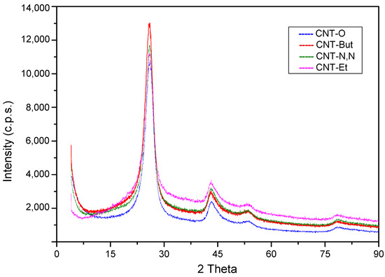 From Figure 4, it can be deduced that functionalization with amines did not alter the general structure of CNTs, because the XRD patterns of amine functionalized CNTs were similar those of CNT-O. Furthermore, the crystallite size of graphite determined by the Scherrer equation was similar in all cases, between 3.2 and 3.4 nm. This means that the cylinder wall structure and the interplanar spacing remained the same.