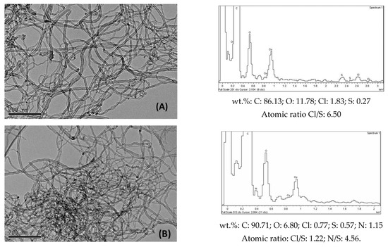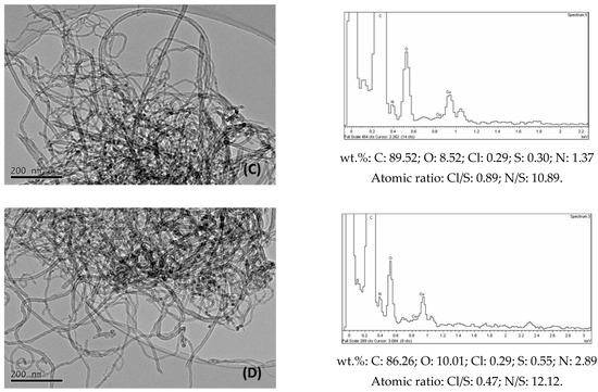 The TEM images of functionalized samples (Figure 6) show darker zones due to the presence of amines. In the EDX spectrum of CNT-OCl, sulphur was unexpectedly found to be present, similarly to that found by Tesonier et al. [41]. It may have been the case that during the acylation step with SOCl2, additional reactions could take place, resulting in the adsorption or anchoring of sulphur-containing groups. The presence of nitrogen in all the functionalized samples was confirmed by the corresponding EDX spectra (Figure 6), where the amounts of elements in wt.% were also indicated. When the nitrogen amounts were transformed from wt.% into mmol amine/g CNT, the obtained values (Table 3) were lower than the values corresponding to those obtained by elemental analysis (Table 1). It must be considered that this last technique involves the bulk of sample, in contrast to the EDX measurements, which are carried out in specific points at the surface of samples.