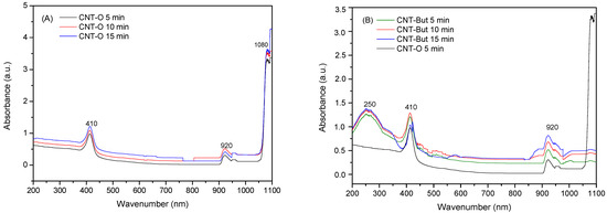 The UV-Vis spectra for CNT-But, as an example of CNT-A samples, are depicted in Figure 7B. Regarding the spectrum of the oxidized nanotubes, the disappearance of the van Hove singularity located at 1080 nm was observed. This may have been due to a partial covalent functionalization of the nanotubes with the amide groups [50], causing the electronic perturbation of the nanotubes and a disruption on the extended π network [50,51], although the singularity located at 920 nm remained. A new band was detected, centred around 250 nm, which can be attributed to the presence of NH groups from the amide functionalities [44]. The functionalization with the amine increased the dispersion of the carbon nanotubes, as deduced by the increment in absorbance units of 0.2 in the baseline of the curve for CNT-But (5 min) with respect to that for CNT-O (5 min). The spectra for the other two CNT-A samples were similar to that for CNT-But and, for simplicity, they are not shown. In conclusion, the results obtained by this technique also confirm the anchoring of the amines to the carbon nanotubes.