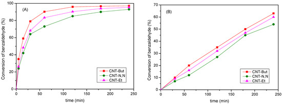 The conversion values of benzaldehyde (in wt.%) in the condensation with ethyl cyanoacetate obtained over CNT-A catalysts at 90 °C (Figure 8A) reveal that the reaction proceeded effectively when amines were anchored to the walls of nanotubes. On the contrary, the activity of CNT-O (not shown) was negligible. Therefore, the small number of metallic impurities that could remain in the oxidized nanotubes seemed to have no influence on the observed catalytic activity. Furthermore, as shown in Figure 6, the CNT-A samples contained small amounts of S, because the starting material for their synthesis, CNT-OCl, already contained it. However, the Cl/S atomic ratio (6.5) of this last sample (Figure 6) decreased significantly when treatment with amines occurred (with values of between 0.47 and 1.22). In addition, the atomic N/S ratios of the CNT-A samples were well above 1 (Figure 6). Therefore, the influence of the S on the catalytic activity seems to not be significant, although it cannot be completely ruled out.