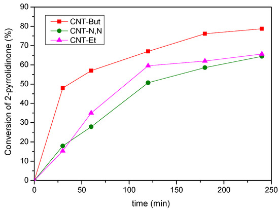 The catalytic activity was expressed in terms of the conversion of 2-pyrrolidinone, which was the limiting reactant. As deduced from Figure 9, the activity followed the same order as for the Knoevenagel condensations: CNT-N,N < CNT-Et < CNT-But. Conversion values of between 64.4 and 78.7% were achieved after 240 min. Again, the best catalyst was CNT-But, with the textural properties having an influence on the catalytic activity. This was followed by CNT-Et. Despite the fact this catalyst had lower SBET and Vpore values than CNT-N,N, the content of mmol amine/g CNT for the first catalyst was the double that of the second one (Table 1), which indicates a combined effect of the basicity of nitrogen atoms and the textural properties of the catalyst over the final activity.