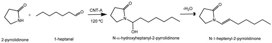 In this work, we reported, for the first time, the synthesis of N-1-heptenyl-2-pryrrolidone via the N-substitution of 2-pyrrolidinone with 1-heptanal over carbon nanotubes functionalized with amino groups under free-solvent conditions. The catalysts were prepared by a process of acylation and subsequent amidation of pre-oxidized carbon nanotubes, and the incorporation of the nitrogen atoms was checked by different characterization techniques. The nature of the groups of the amine molecule was significant in terms of the functionalization degree, with this being the highest for ethylenediamine, for which the nitrogen atoms were more accessible and had no bulky substituents. The basic character of catalysts was firstly tested by Knoevenagel condensation of benzaldehyde with two different methylenic compounds. The order of the reaction, i.e., CNT-But > CNT-Et > CNT-N,N, was the same as that for the synthesis of N-1-heptenyl-2-pryrrolidone. The catalytic activity was influenced by a combined effect of the basicity, which depended on the amount of nitrogen, and the textural properties of solids. Yields of 45–60% to the desired product were achieved after 3 h. The recyclability of CNT-But catalyst was probed by checking the activity after four cycles of reaction. This process could be extended to the synthesis of other N-substituted γ-lactams, by selecting the starting γ-lactam and/or the type of aldehyde, which would result in a variety of compounds with interesting biological and pharmacological applications. Furthermore, the CNT-A samples were found to be active in Knoevenagel condensation, which is one of the imperative and essential condensation processes in synthetic organic chemistry. It would be expected that the use of these catalysts in the condensation of different aldehydes with several methylenic compounds could lead to the synthesis of a series of specialty chemicals and intermediates that have the potential to be widely used in various industries.