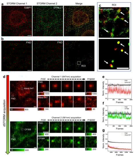 Dual-color dSTORM acquisition workflow with fluorescence nanodiamonds (FNDs). (a) Representative dSTORM images of MCF10A cells upon targeting of 53BP1 (red) and DYNLL1 (green), stained with AlexaFluor647 and CF568, respectively. Shown are (from left to right) the single-color 53BP1 and DYNLL1 images and the dual-color dSTORM image. (b) FNDs spots positions obtained from red and green STORM channels. (c) Zoomed region of the highlighted area (white dashed box) in (b). The upper panel shows the localization events (each colored pixel represents one localized single-molecule event) recorded during the acquisition. Representative FNDs are indicated by the arrows. In the lower panel, the recorded events were transformed into Gaussian PSFs of fixed width and segmented (see Materials and Methods and Supplementary Protocol for details) to highlight the drift correction (Scale bar ROI: 1 μm) (d) Representative images of dual-color dSTORM acquisition. The fluorophore blinking in timelapse imaging (15,000 frames) for each channel (53BP1-AlexaFluor647 and DYNLL1-CF568) is shown. The bright spots in the image correspond to the fluorescence emission of individual fluorophores. Most of the fluorescent labels are switched off such that the fluorescent molecules are well separated. FNDs show no blinking properties, indicating high photostability in both channels. (e,f) Comparison of the photon emission from fluorescent nanodiamonds (FND, 40 nm; black), Alexa Fluor 647 dye (red) and CF568 dye (green) over 2000 acquired frames using 561 nm and 647 nm laser excitations, measured in the highlighted regions (white dashed box). (g) Fluorescence decrease of the 40 nm FNDs (black) and the AlexaFluor647 (red), over 15,000 frames of image. Scale bar: 3 μm.