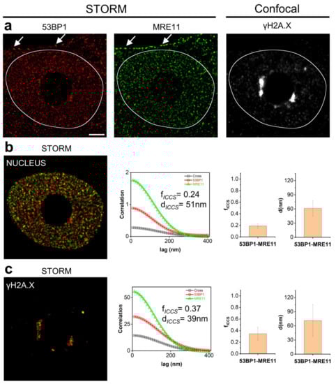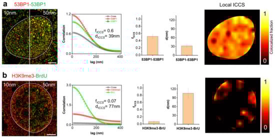 Figure 3 shows an example of such an approach. 53BP1 and MRE11 are members of the DNA Damage Response (DDR) molecular machinery. ICCS analysis performed on the entire cell nucleus revealed a colocalized fraction of fICCS = 0.19 ± 0.03 (mean ± SD, n = 6 cells) and a value of the mean distance d d53BP1-MRE11 = 61 ± 16 nm (mean ± SD).