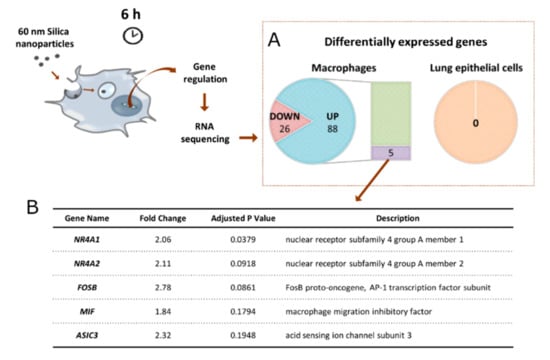 (A) Whole transcriptome screening via RNA sequencing upon exposure of A549 lung epithelial cells and primary human monocyte-derived macrophages (MDMs) to 60 nm SiO2 NPs for 6 h. Number of differentially expressed genes in lung epithelial cells and macrophages with an adjusted p-value of less than 0.2. No changes in the gene expression were observed for A549 cells. In MDM cells, 117 genes were found to be differentially regulated (26 down-regulated and 88 up-regulated), but only five revealed a greater than 1.5 fold change. (B) List with the five up-regulated genes in MDM cells.