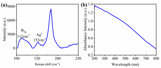The SnSe nanoplates were fabricated by the liquid-phase exfoliation method [20], which involved SnSe single crystal flakes being added to dispersant in reagent bottles using the bath sonication process as dispersion, which was centrifuged in the end. Additionally, the SnSe nanoplates were 1 mg/mL from MUKE NANO Technology Co., Ltd. The finite lateral sizes of SnSe nanoplates are approximately 0.05–1 μm, whereas the thickness varied from 1 to 10 layers. Figure 1a shows the Raman absorption spectrum of the SnSe nanoplates. Two prominent peaks at 112 and 152 cm−1 agree well with the B3g and Ag3 modes of single-phase SnSe [20,21]. The absorption spectrum (measured by a UV-VIS spectrophotometer) of SnSe nanoplates is shown in Figure 1b. In the wavelength range of 200–800 nm, the SnSe nanoplates keep the strong absorption, which indicates that SnSe-based modulators can be efficiently carried out at wide spectral bands.