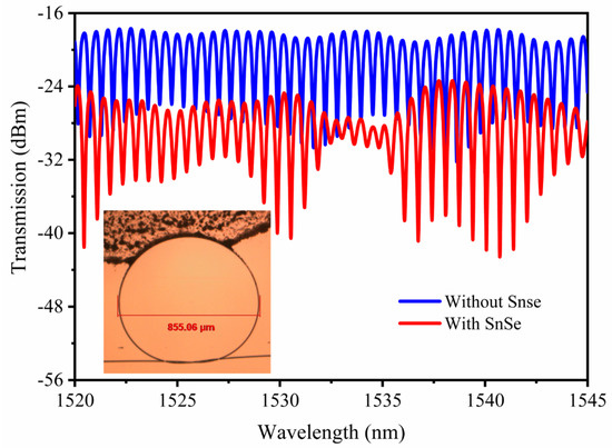 Transmission spectra of the MKR with and without SnSe nanosheets in the range from 1520 to 1545 nm. The blue line represents before deposition and the red line represents after deposition of SnSe nanosheets. The inset is the microscope image of the MKR overlaid with SnSe nanoplates. The diameter of MKR is 855.06 μm.