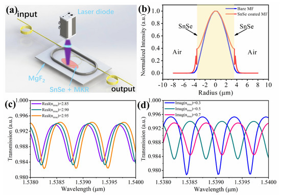 Figure 4a shows the schematic diagram of the all-optical SnSe-coated microfiber modulator. When free-space illumination occurs by an external laser, the change in the holes and electrons will lead the SnSe nanosheets of the conductivity to change, and both the real and imaginary parts of the refractive index of the SnSe nanosheets are modulated, which further changes the mode effective refractive index of the SnSe-coated microfiber and finally tunes the ER and the wavelength shift of SnSe-coated MKR.