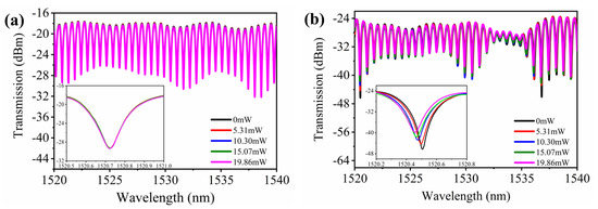 Transmission spectra of the MKR under the 405 nm illuminated laser. (a) Without SeSn nanosheets. (b) With SeSn nanosheets. Both insets are enlarged views of the resonance dips near 1520.5 nm.