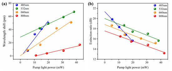 (a) Resonance wavelength shift at wavelength of 1520.5 nm versus the pump power of the violet, green, red and near-infrared light lasers, respectively. (b) ER at wavelength of 1520.5 nm versus the pump power of the four kinds of lasers, respectively.