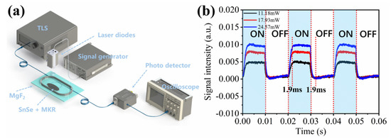 (a) Experimental setup for device response time measurement. (b) Response time of SnSe-coated MKR under 405 nm external pump light with various power levels.