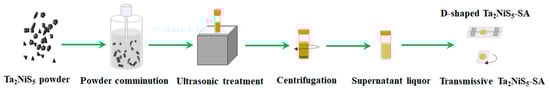 Ternary chalcogenide Ta2NiS5 powder was purchased from Shenzhen Six Carbon Technology Development Co., Ltd. (Shenzhen, China). The preparation process of the Ta2NiS5-SA is shown in Figure 1. In detail, 0.3 g Ta2NiS5 powder was dissolved in 30 mL isopropyl alcohol (IPA, Macklin, Shanghai, China) solution under uniform stirring for 3 h. The dispersion was sonicated at 300 W for 12 h and a temperature below 20 °C. The solution was centrifuged at 6000 rpm for 20 min, and few-layer nanosheets were obtained from the supernatant liquid. Then the supernatant liquid with Ta2NiS5 nanosheets was spun onto a glass sheet and a (side-polished) D-shaped fiber (drying for 24 h at room temperature) to achieve Ta2NiS5-SA. 2D materials with different layer numbers have unique optical performances [39]. In the characterization of Ta2NiS5 nanosheets, the solution material was dropped on the silicon wafer and dried naturally for 24 h firstly to avoid impurity elements from the solution. To investigate the morphology of the fabricated Ta2NiS5 nanosheets, atomic force microscopy (AFM, MFP-3D Infinity, Asylum Research, Oxford, UK) was used. The 3D and 2D results are shown in Figure 2a,b, the average thickness of the fabricated multi-layer Ta2NiS5 nanosheets was 12~15 nm throughout the thickness profile as displayed in Figure 2c, corresponding to about 19~23 layers thick (the layer thickness of Ta2NiS5 is approximately 0.63 nm) [30]. Scanning electron microscopy (SEM, JSM-5910LV, JEOL, Tokyo, Japan) and energy-dispersive X-ray spectroscopy (EDS, Oxford Instruments, Oxford, UK) were used to investigate the micro surface topography and elemental composition of a Ta2NiS5 nanosheet, where the impurity of C, O, and other elements in the air was excluded, as displayed in Figure 2d. Three elements (S, Ni, Ta) were identified with a weight ratio of 27.29:10.06:62.65, and the corresponding atomic ratio was 62.49:12.38:25.13 (~5:1:2), illustrating the purity of the Ta2NiS5 nanosheets. Raman measurement of the Ta2NiS5 nanosheet was conducted by Raman spectroscopy (excitation wavelength: 532 nm, inVia, Renishaw, New Mills, UK), and the result was shown in Figure 2e. Three peaks located at 62.6, 124.9, and 146.2 cm−1 are observed in the detection range of Figure 2e, corresponding to one twisting motion for mode B2g and two stretching motions for 2Ag and 3Ag [29]. Compared with the result in [29], the Raman peaks of the three modes in our results show a little red-shifted and slightly different peak intensities. The first phenomenon results from the thermal anharmonicity of the Ta2NiS5 nanosheets. The latter occurs mainly due to the thickness-dependent light absorption capacity, optical interference, and band structure with a layer thickness of layer materials [29]. A UV/VIS/NIR spectrophotometer measured the linear transmission spectrum from 1000 nm to 1600 nm was measured by a UV/VIS/NIR spectrophotometer (LAMBDA, Pekin Elmer Inc., Waltham, MA, USA). As shown in Figure 2f, the transmittance of Ta2NiS5 nanosheets solutions was 73.2%@1036 nm, 72.6%@1064 nm, and 54.2%@1550 nm. All the characterization procedures for Ta2NiS5 nanosheets solutions were performed at room temperature.