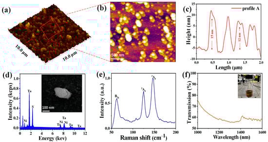 (a) 3D Morphology image of Ta2NiS5 nanosheets. (b) 2D Morphology image of Ta2NiS5 nanosheets. (c) Corresponding thickness distribution of Ta2NiS5 nanosheets. (d) EDS image and SEM image (Inset). (e) Raman spectrum of the Ta2NiS5 nanosheet. (f) Transmission spectrum of the Ta2NiS5 nanosheets solution (IPA).