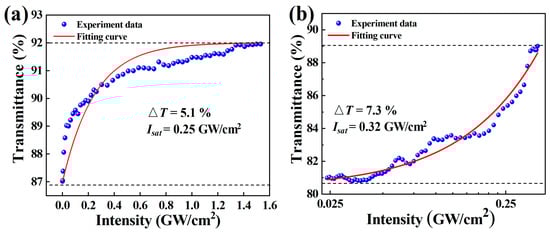 Due to the limitation of experimental conditions, P-scan [34] and Z-scan [40] methods were used to measure the saturable absorption of the Ta2NiS5-SA. To investigate the nonlinear optical characteristics of the as-fabricated Ta2NiS5-SA at 1.5 μm, a balanced twin-detector measurement system was employed (1550 nm, 600 fs, 7.36 MHz). Figure 3a shows the P-scan curves of Ta2NiS5-SA. When only the single-photon absorption is considered, the following formula can be obtained [40,41,42]: