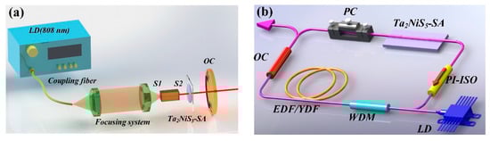 To further research the optical performance of the Ta2NiS5-SA, two all-fiber lasers were assembled; two fiber laser systems (EDF and YDF) with different operating wavelengths were constructed. A 4 m EDF (4.45 dB/m@980 nm) was used to generate a pulse laser in the NIR telecommunication window (1.5 μm). In addition, a one-meter long YDF (250 dB/m@980 nm) was used to generate a pulse laser at 1 μm. An experimental schematic diagram of the ring cavity design is shown in Figure 4b. The fiber laser system consists of a 980/1550 nm (or 980/1060 nm) wavelength division multiplexer (WDM), a 980 nm laser diode (LD), a polarization-independent isolator (PI-ISO), a polarization controller (PC), an optical coupler (OC), a doped fiber and a D-shaped fiber. The interaction length of the D-shaped fiber is 10 mm, and the distance from the fiber core boundary to the lowest point of the D-shaped region is ~1 μm. The Ta2NiS5 nanosheets solution was dropped onto the side-polished part of the D-shaped fiber to form SAs inserted between the PC and PI-ISO.