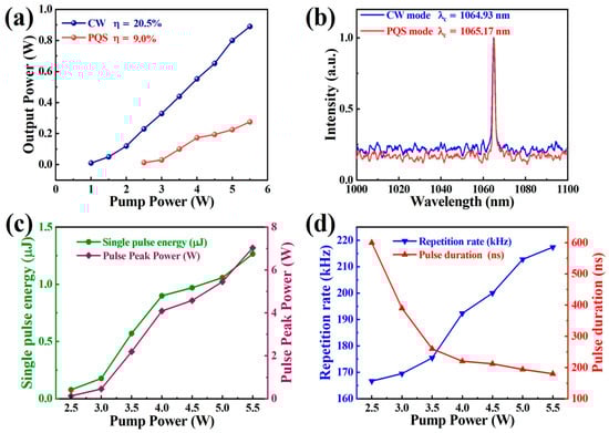 (a) Average output power of CW and PQS Nd: YAG lasers versus pump power; (b) output spectra of the CW and PQS Nd: YAG lasers; (c) single pulse energy and pulse peak power versus pump power; (d) pulse repetition rate and pulse duration versus pump power.
