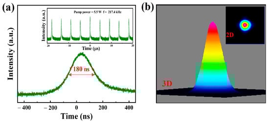 (a) Stable pulse train at the highest repetition rate and shortest pulse profile and (b) 2D, 3D beam profiles of the PQS Nd: YAG laser at the highest pump power (5.5 W).