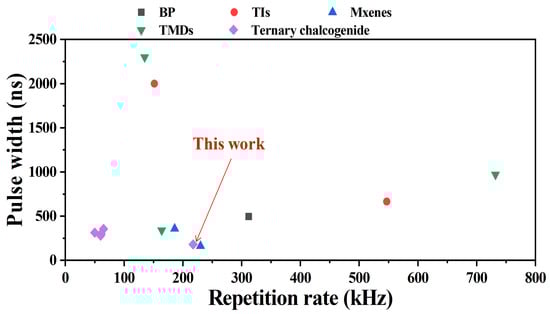 In laser application, short pulse width and high optical efficiency are both important to a PQS bulk laser [43]. Table 1 summarizes the laser performances of PQS solid-state lasers with different new 2D material-SAs. The corresponding data (pulse width versus repetition rate) are shown in Figure 7; the different marks represent different new 2D materials. Compared with the Ta2NiS5-SA applied in 1.9 μm PQS bulk laser [30], the 1 μm PQS bulk laser based on Ta2NiS5-SA in this letter shows a shorter pulse width (approximately 57.5%). The different optical efficiency may be due to the different linear absorption (1.9 μm: ~19%, 1.0 μm: ~27.4%) and nonlinear absorption properties (1.9 μm: ∆T = 12.2%, Isat = ~5.1 MW/cm2, NL = 6.9%, 1.0 μm: ∆T = 7.3%, Isat = ~0.32 GW/cm2, NL = 11.6%) of Ta2NiS5 materials in 1.9 μm [30] and 1 μm. But compared with new 2D material SAs applied at the same NIR region (1 μm), narrower pulse width and relatively high optical efficiency were both obtained based on Ta2NiS5-SA. Notably, an optimized cavity design and an excellent SA are essential to achieving a high-quality PQS laser [44]. During the experiments, the Ta2NiS5-SA possessed good characteristics, which could still maintain good modulation performance after placing in air for many days or after a long period of high-power excitation. Thus, the as-prepared Ta2NiS5 -SA would be a good candidate for PQS solid-state lasers in the NIR region.