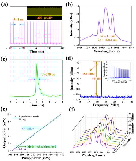 ML operation of the YDF laser was obtained when the pump power reached 155 mW by adjusting the PC in the cavity Figure 8 illustrates the characteristics of the ML fiber laser. Figure 8a shows the ML pulse train. The time interval between each pulse was 54.1 ns, which well matches the laser cavity length of 16.9 m. Figure 8b displays the optical spectrum of the ML pulses. The obtained central wavelength was located at 1036.6 nm, and the 3 dB spectral bandwidth was 1.1 nm. The trace of an ML laser pulse measured with the high-speed oscilloscope is shown in Figure 8c. The FWHM of the laser pulse duration was 270 ps. A strong signal peak with an ML repetition rate of 18.5 MHz was observed, and the signal-to-noise ratio (SNR) was measured to be approximately 64 dB, as displayed in Figure 8d, indicating that the obtained laser pulses have relatively high stability. The relationship between pump power and output power is recorded in Figure 8e, and the slanting efficiency is 2.7% by fitting a straight line. As shown in Figure 8f, the spectra were very stable with a small change within 8 h according to continuous monitoring of the output spectra of the YDF laser. In Table 2, we compared output characteristics of fiber lasers based on various 2D material SAs, and our results are similar to those based on other 2D materials.