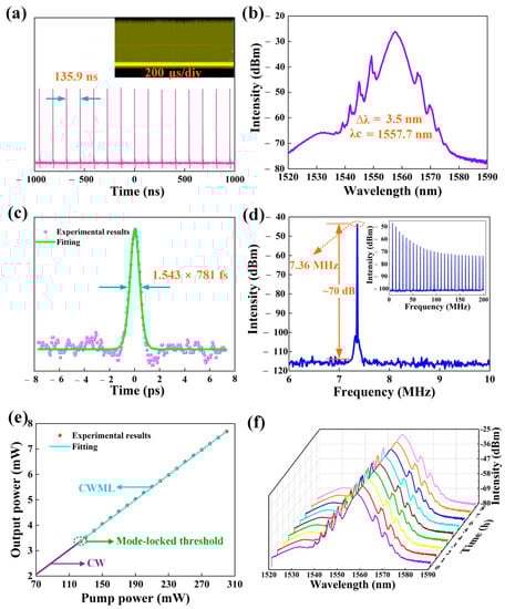 To prove that Ta2NiS5 can work over a wider range of wavelengths, the fabricated Ta2NiS5-SA was used in the EDF laser cavity to generate an ultrafast laser pulse at approximately 1.5 μm. When the pump power reached 125 mW, stable ML laser pulses were observed by rotating the PC in the intracavity. Figure 9 shows the characteristics of the EDF ML laser. Figure 9a displays the time trace of the oscilloscope with an interval of 135 ns, corresponding to a repetition rate of 7.36 MHz. The illustration in Figure 9a illustrates the ML laser’s uniform intensity pulses, confirming the ML laser’s stability. As displayed in Figure 9b, the optical spectrum of the ML laser was centered at 1557.7 nm with a 3 dB spectral width of 3.5 nm. The autocorrelation trace for the soliton ML fiber laser is displayed in Figure 9c. The pulse autocorrelation trace’s full width at half maximum (FWHM) was 1.205 ps. The hyperbolic sech2 function is used to fit the autocorrelation trace curve measured in the experiment. Through the deconvolution factor of the sech2 pulse model of 1.543, the actual pulse width can be calculated as 781 fs. The calculated time-bandwidth product is 0.338.